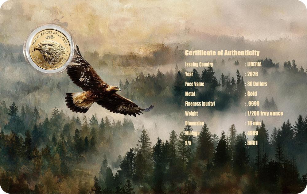 這枚尊貴的1/200盎司金幣旨在致敬美國錢幣學中最具代表性的象徵之一:美國鷹洋金幣。金幣採用.9999純金鑄造,表面經精細的精製工藝處理,並以激光雕刻凸顯經典美國圖案的複雜紋理和立體感。這枚面值為30美元的迷你金幣由利比里亞發行,將永恆的國家象徵意義與現代鑄造工藝完美融合。金幣採用精美卡紙包裝,全球限量發行4999枚。