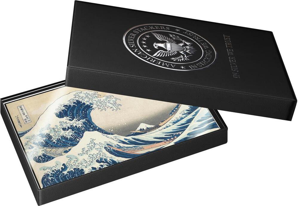 這款精美的銀箔致敬葛飾北齋的著名傑作《神奈川衝浪裡》,這幅畫作是日本藝術中最具代表性的作品之一。畫面描繪了巨浪洶湧,威脅著船隻,背景是像徵力量與美麗的富士山。產品裝於優雅的展示盒中,配有保護膠囊和真品證書。全球限量發行1999件!