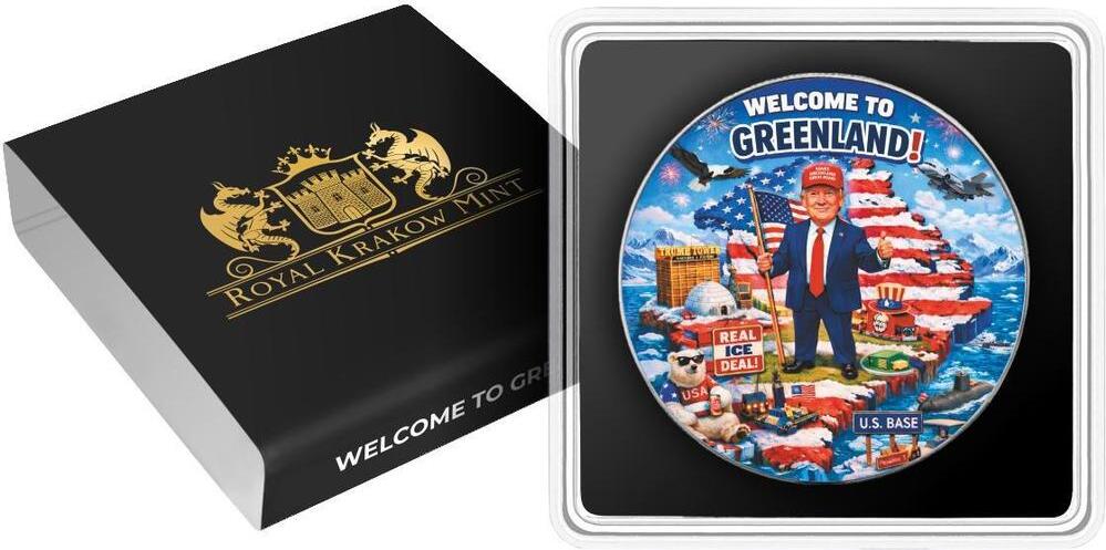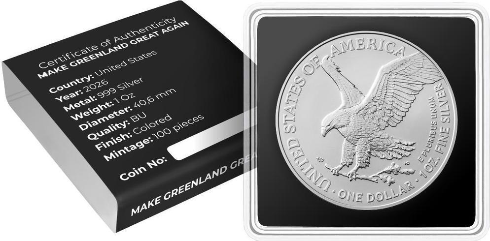 這枚氣勢恢宏的1盎司銀幣將格陵蘭島置於現代北極關注的中心,冰雪、權力與野心在此交會。格陵蘭島幅員遼闊,戰略地位舉足輕重,且具有鮮明的象徵意義,如今被重新詮釋為全球影響力和存在感的焦點。該銀幣以美國鷹洋銀幣為底,並採用先進的全彩數位印刷技術,將地理特徵轉化為鮮明的象徵意義,巧妙地融合了國家形象、基礎設施和北極神話,構成一幅完整的視覺敘事。這款引人注目的收藏品將於2026年發行,面額1美元,全球限量發行100枚。